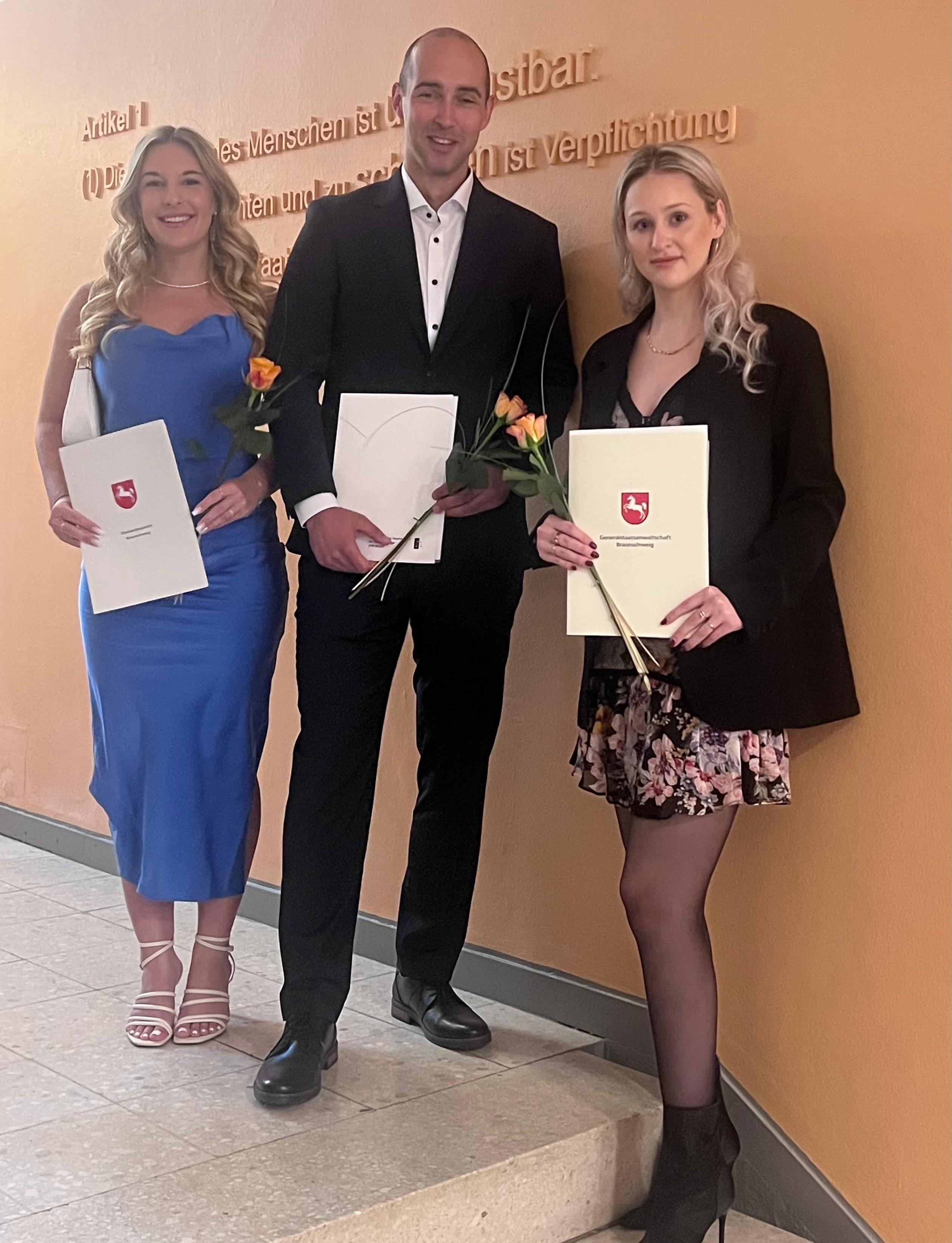 Im Zuge der Feierstunde haben der Vizepräsident des Oberlandesgerichts Dr. Christian Jäde und Frau Leitende Oberstaatsanwältin Dr. Melanie Redlich von der Generalstaatsanwaltschaft Braunschweig zwei Dipl. Rechtspflegerinnen unter Berufung in das Beamtenverhältnis auf Probe zu Justizinspektorinnen ernannt.